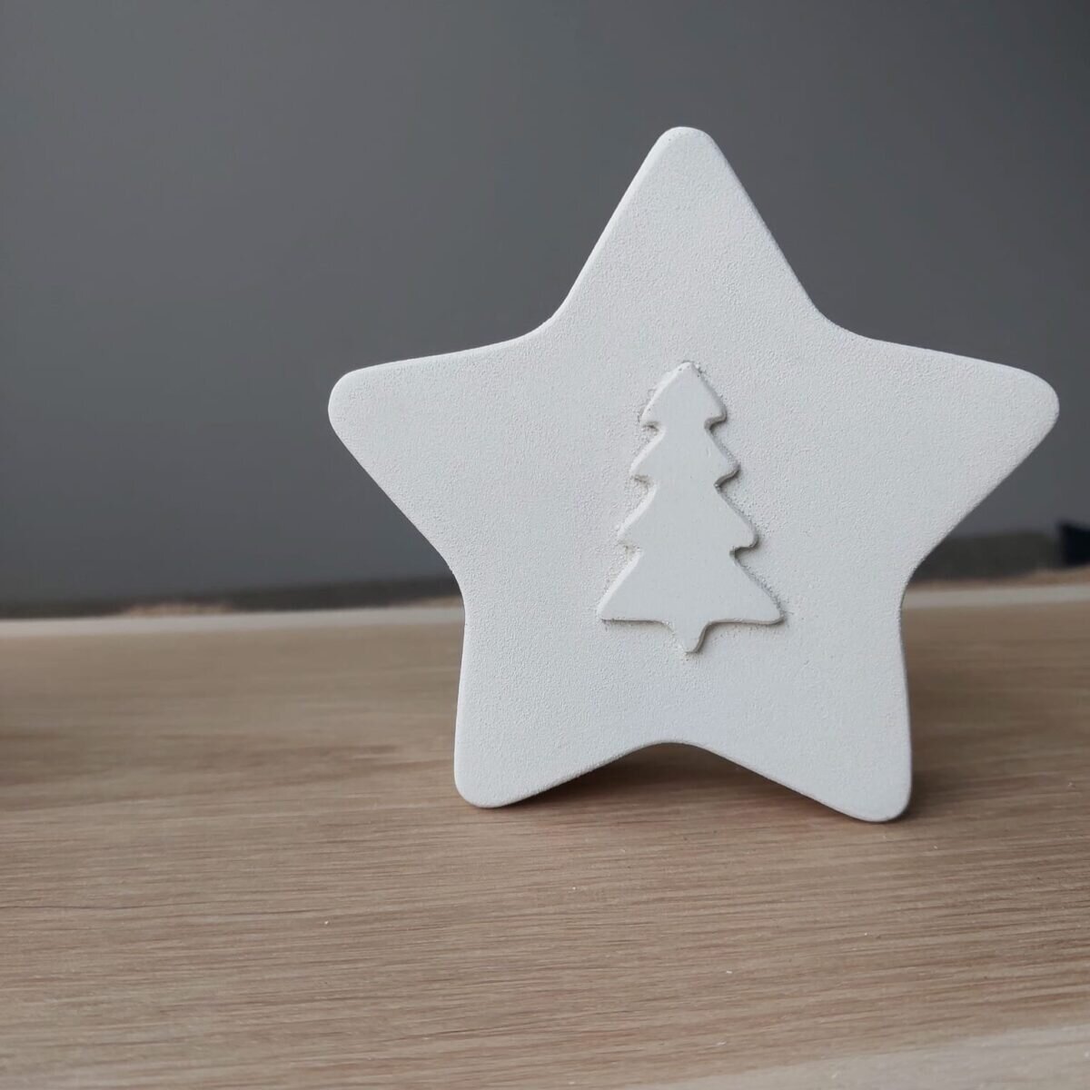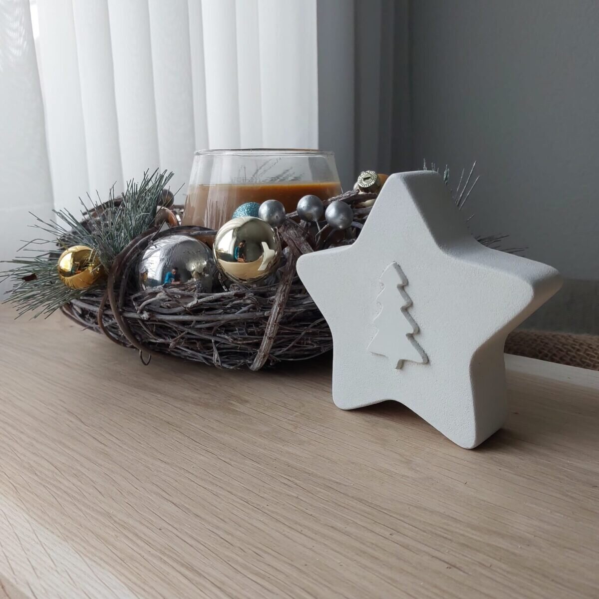 Moderner Betonstern aus weissem Beton mit fein erhabenem 3D-Tannenbaum-Motiv. Handgegossen, stabil und ideal als Weihnachts- und Winterdekoration.
